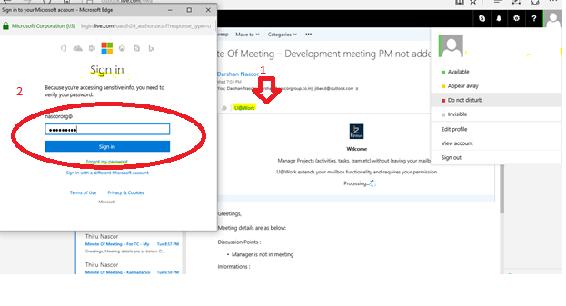 Once logged into Office 365, from Outlook, first time, when U@Work is accessed, Microsoft Sign-in window for authentication comes up. Here, please make doubly sure that 'same existing Office 365 login credentials' (email id and password) is given. This is very important for U@Work to function properly.