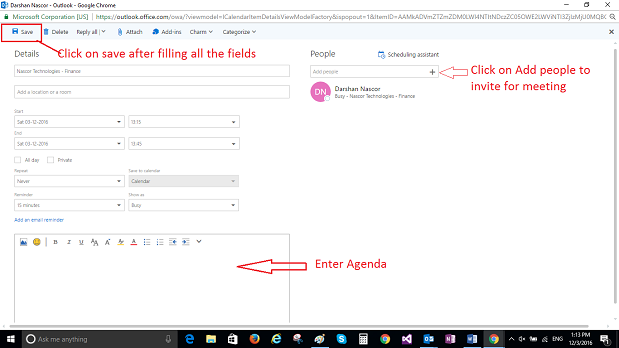 In Browser version, below page will be displayed, create/modify the details and fill the required fields as shown below and click on send. Meeting invite will be sent to invited attendees