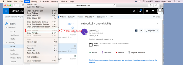 3. With Reader Mode in Safari Browser on Mac, We are not sure as it depends on Apple, Microsoft to allow Outlook Add-ins to be accessed. Check URL & image below
