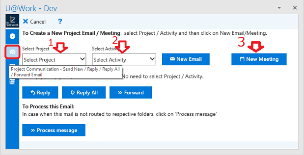 1. Occasionally, when sender through U@Work -> project communication and sends an project email from Desktop Office Outlook 2013 or 2016 client, the email may not get routed, to respective work folder at recipient mailbox. This may happen, when, recipients email domain is different from sender’s email domain. In such cases, recipient has to select the email not routed, go to U@Work -> project communication and click on ‘Process message’ button to route the email to respective folder. This is under investigation.