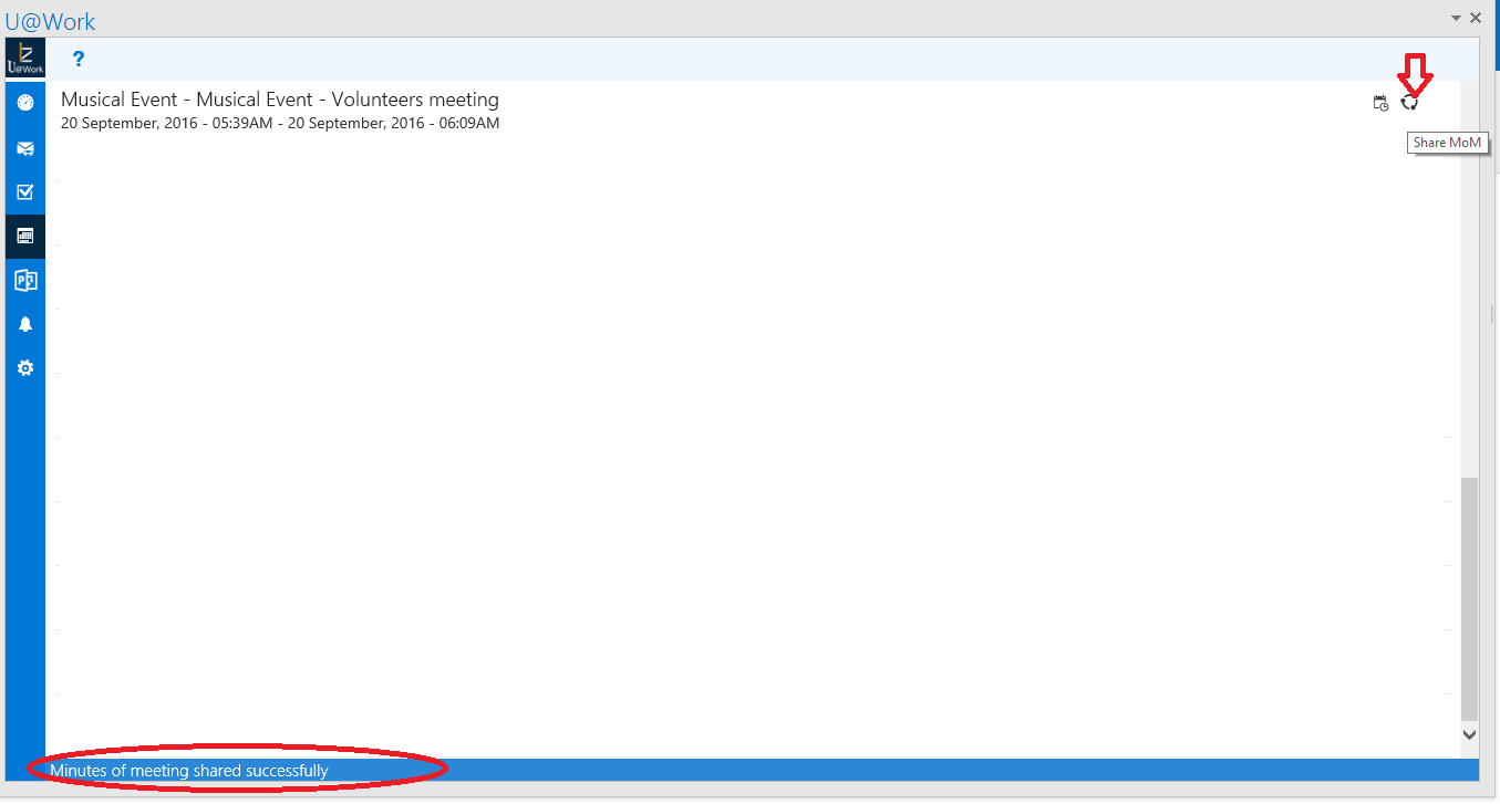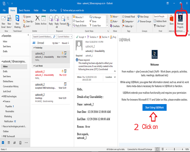 Click on U@Work from Outlook ribbon menu bar (appears as add-in command). On the right side, a UI window will be open to load with U@Work.