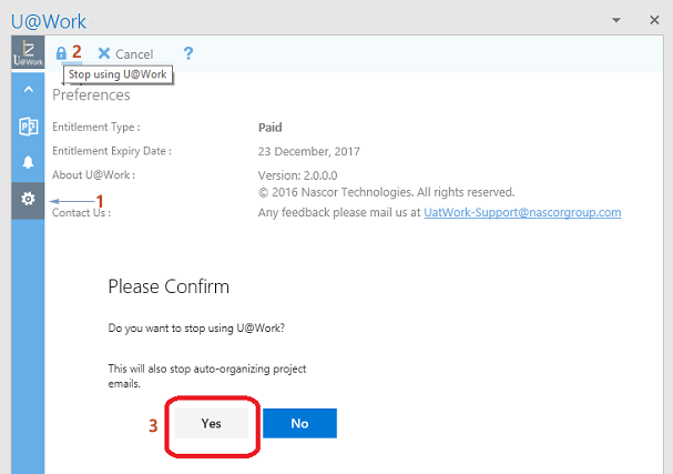 To Stop Using U@Work, as, shown below, 1. Select the 'Gear' icon, then, 2. Select the 'Lock' icon present in the top left corner. 'Please Confirm' message appears, 3. Choose 'Yes'