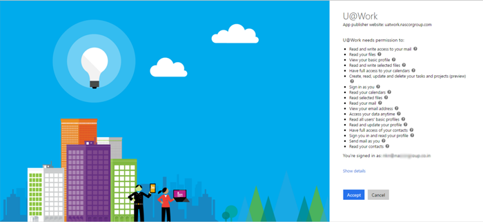 First time, users will have to authenticate using 'same' existing Office 365 Outlook credentials. After authenticating to Microsoft Sign-in window,a permission screen will be displayed as below and users have to 'Accept' to give the requested permission for U@Work to properly function