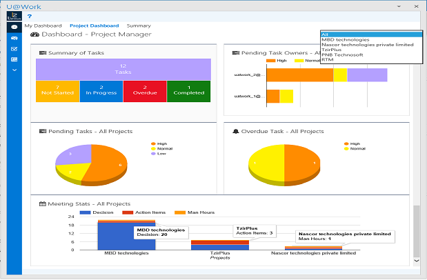 Project dashboard: As Manager, different info-grapic views of overall data and metrics of all work items such as, project tasks and meetings is displayed with drop down options to get info-grapic views project vise also.