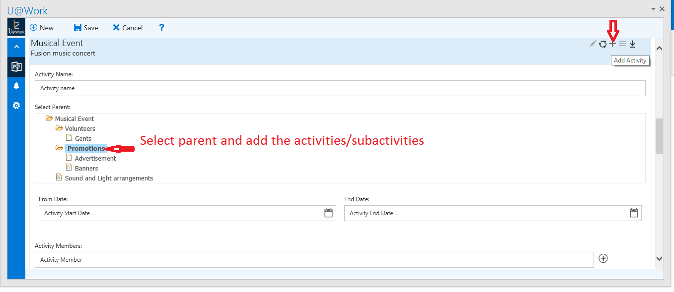 Select the activity under which you want to create an activity. Enter the activity name and the member(s) again by clicking + button. This will create the tree structure in the inbox folder under the activity name as you add and save the activity folder.