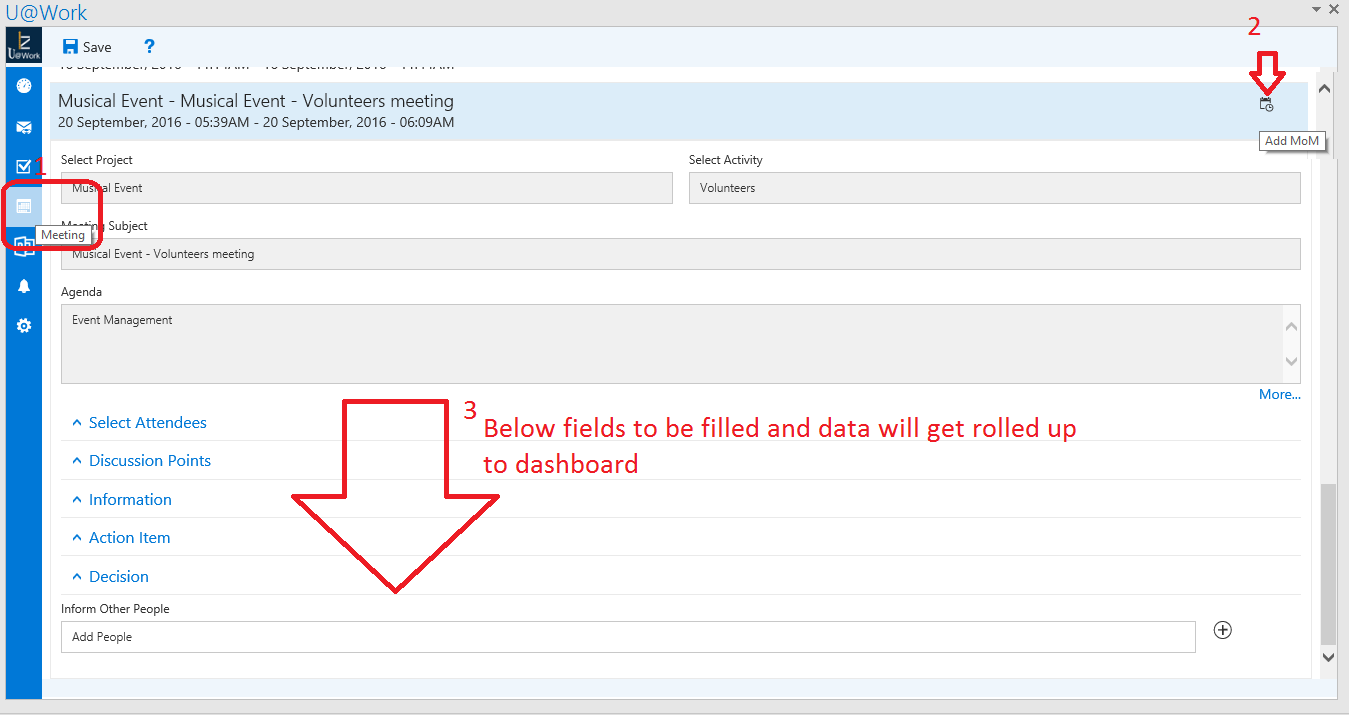 Infographic Dashboard with insightful data & metrics, will provide the overall health and status of the work items such as projects, tasks, meeting action items, decisions etc. A work day can start with dashboard. The data & metrics in the dashboard will be automatically populated / updated.