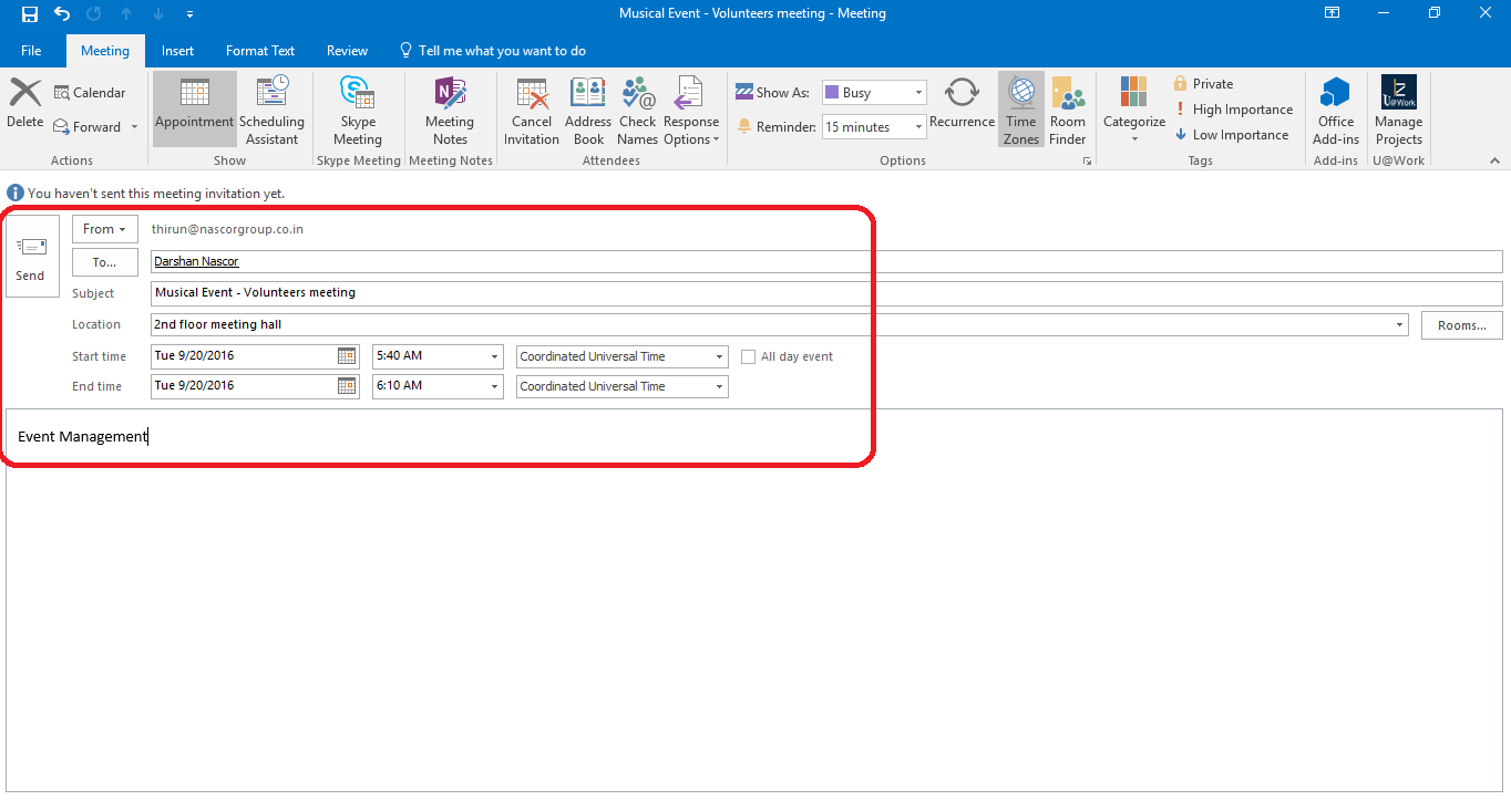 In Desktop outlook 2016, below page will be displayed, create/modify the details and fill the required fields as shown below and click on send. Meeting invite will be sent to invited attendees
