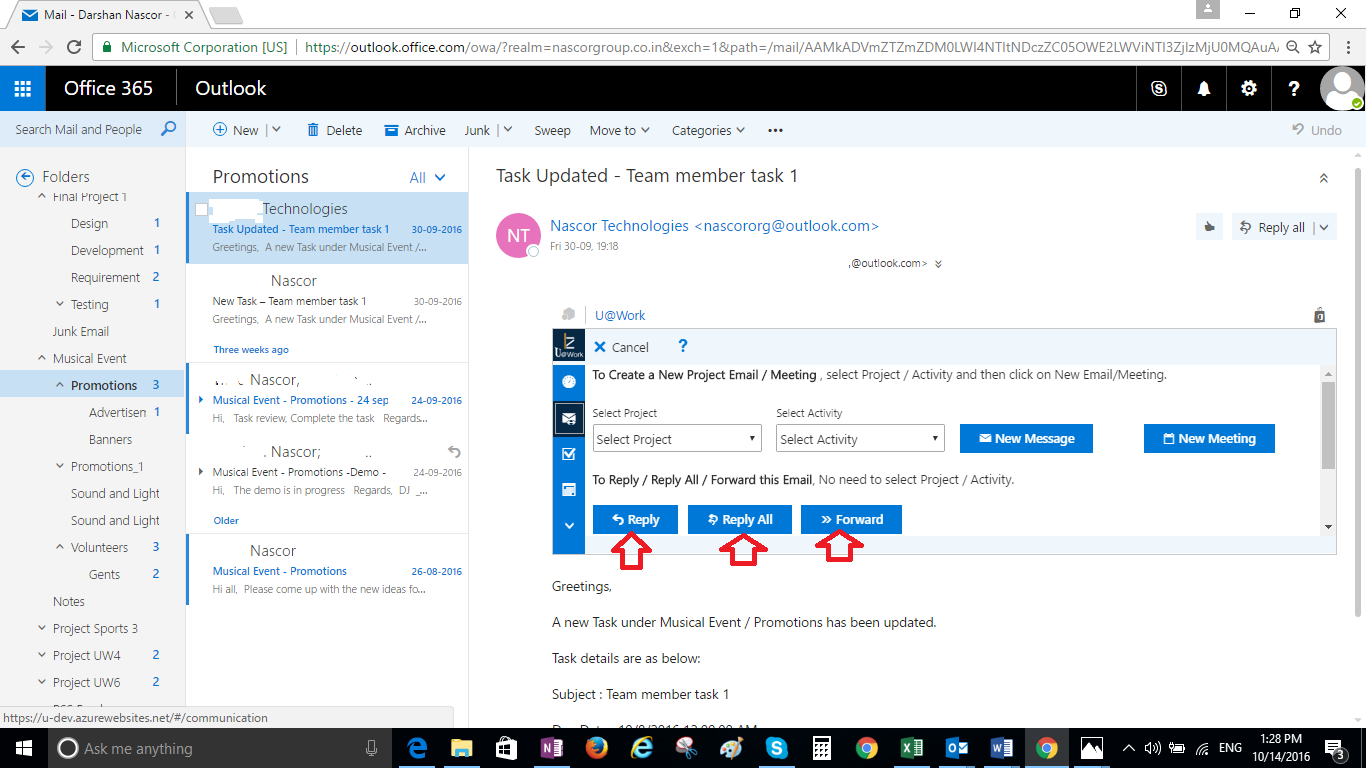 1. Select an email to 'Reply/Reply All/Forward' from the project folder and access U@Work from this mail.
