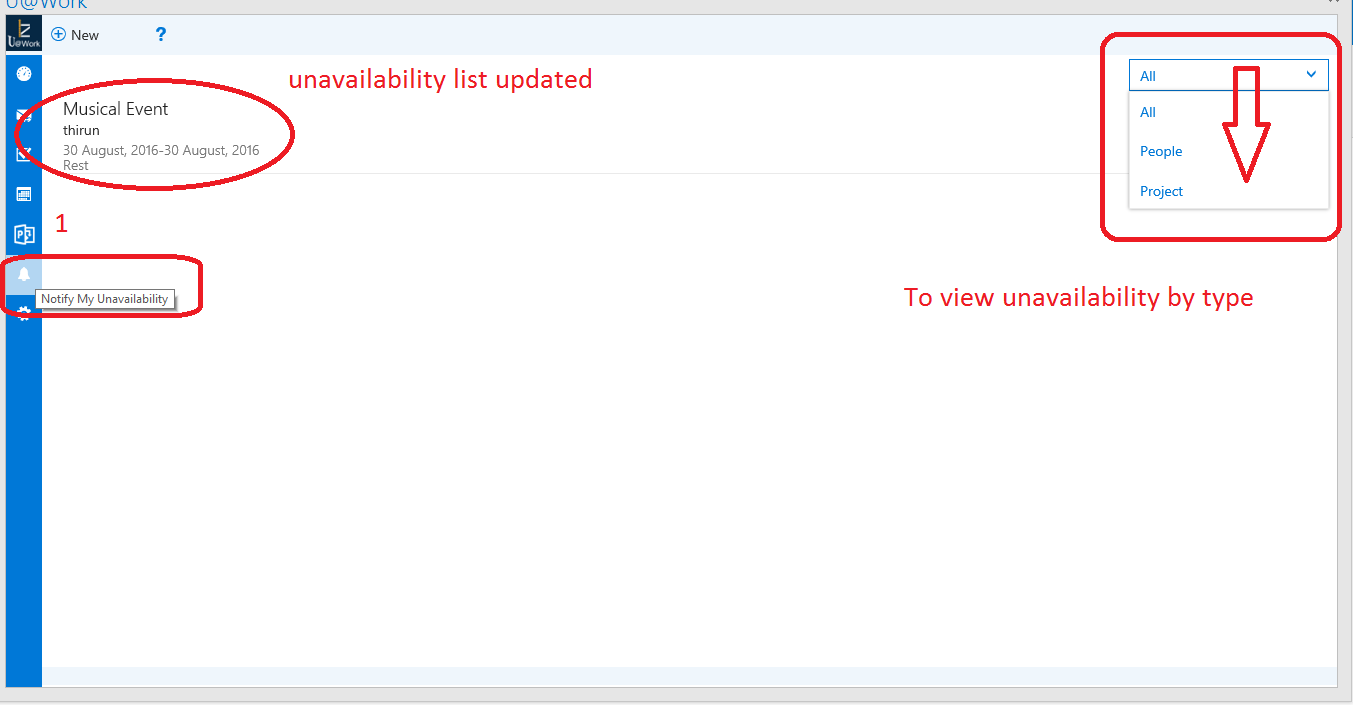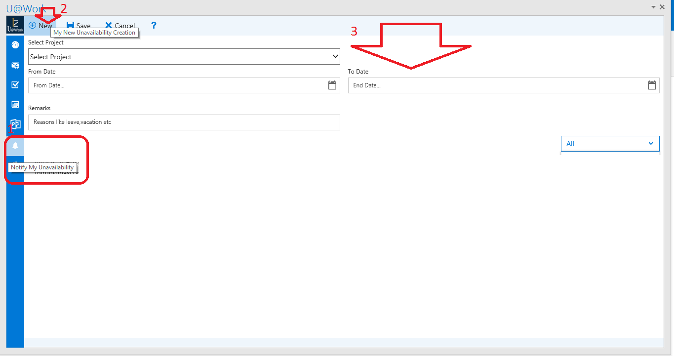 Select 'Notify My Unavailability' icon and from the screen, any team member selects Project and inputs unavailability dates. After saving, a mail is automatically sent to Project Owner/Manager.