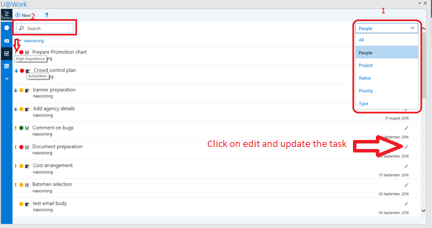 User can filter the tasks according to All, People, Project, status, Priority and type and search box is provided.